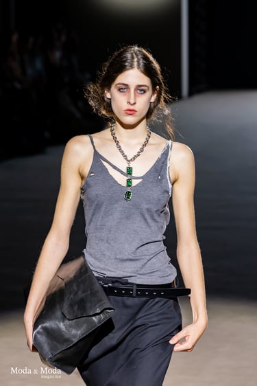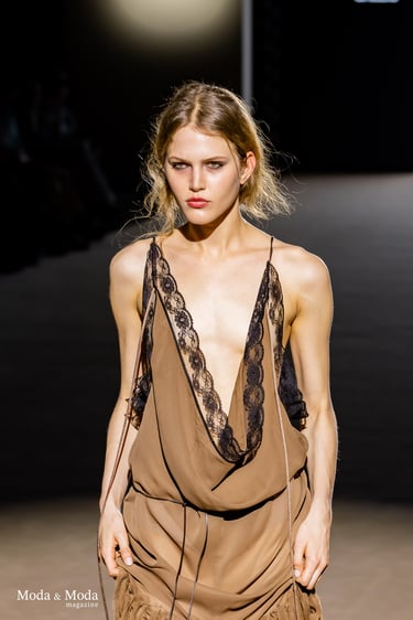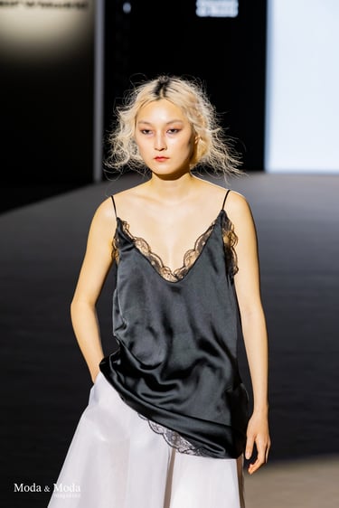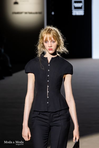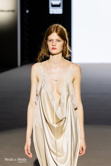 La colección “LÍMITE ETÉREO” destaca por su investigación en volúmenes, tejidos ligeros y una paleta cromática que oscila entre tonos neutros y acentos vibrantes, reflejando una narrativa que invita a cuestionar las fronteras entre cuerpo, espacio y emoción.