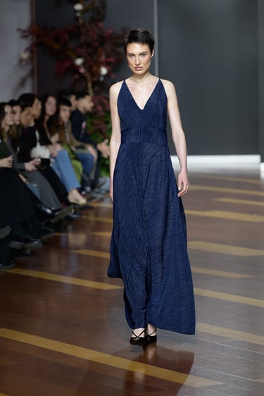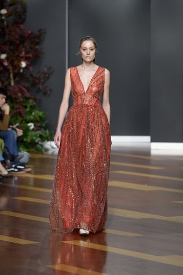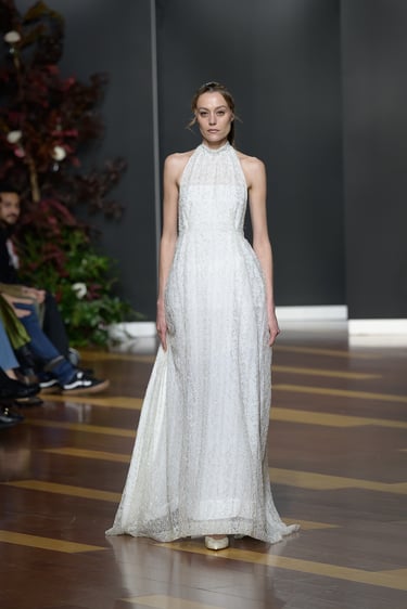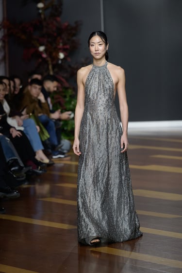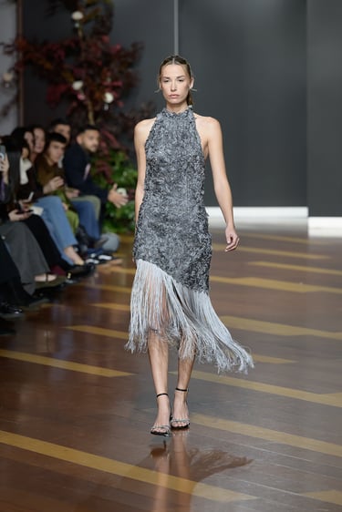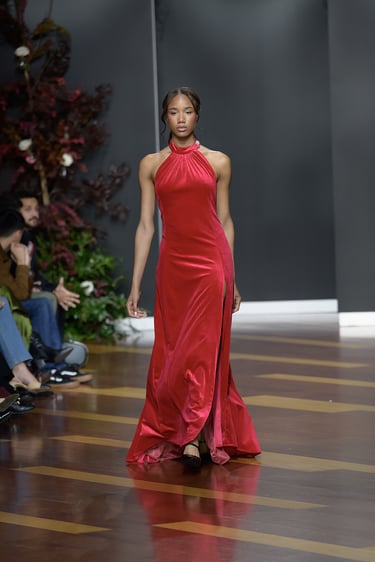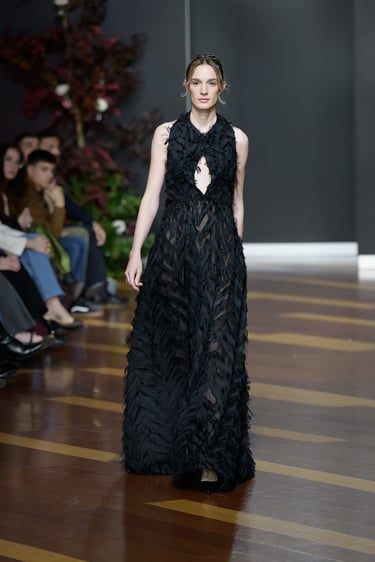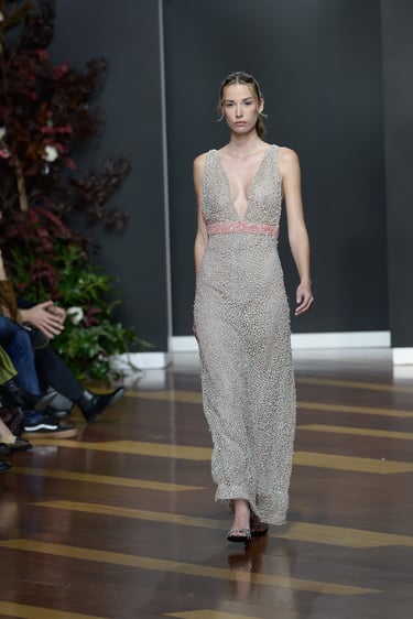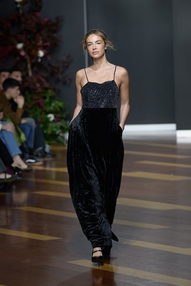 Las prendas destacan por sus siluetas variadas —lenceras, ceñidas o con volumen—, con el cuello halter y las espaldas descubiertas como elementos protagonistas. Los tejidos brillantes como el terciopelo o el tafetán se combinan con detalles de perlas, pedrería, flecos y plumas. La paleta, sobria y sin estampados, refuerza una elegancia atemporal dirigida a una mujer segura, cosmopolita y amante de la artesanía.