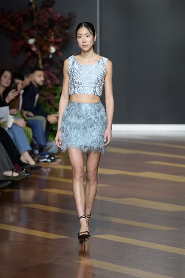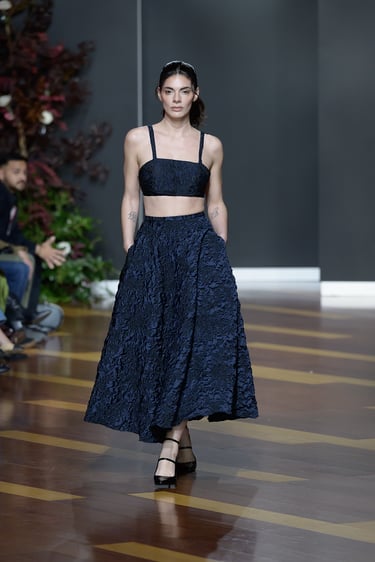 “Distira” —que significa “brillo” en euskera— está pensada para la temporada otoño-invierno 2026/27. Inspirada en la elegancia y el glamour de San Sebastián, la colección recorre distintos momentos de su historia, desde la Belle Époque hasta los años 20, sin olvidar la influencia de Cristóbal Balenciaga y el Festival de Cine de la ciudad.