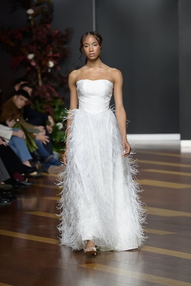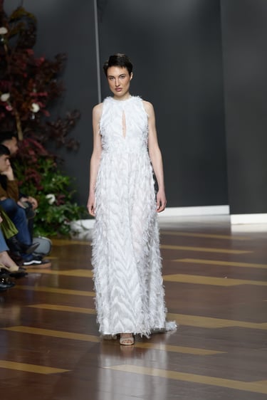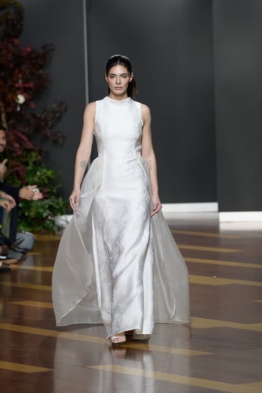 Confeccionada en tejidos nobles como organza de seda, cloqué y gasas, la colección incluye desde reinterpretaciones en blanco de modelos icónicos hasta nuevas piezas con pedrería, plumas y espaldas descubiertas. Está pensada para novias que buscan un diseño único, con un fuerte vínculo con la tradición artesanal.