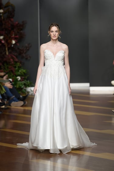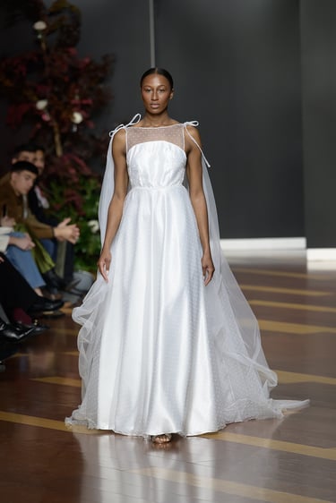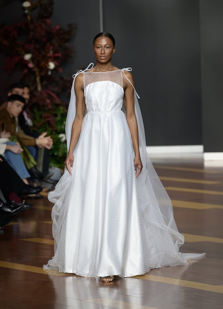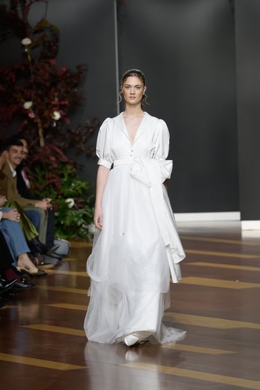 Por su parte, “Zuriñe” —“la que es blanca”— marca el lanzamiento de la primera colección nupcial de la firma para 2027. Nace como respuesta al creciente interés por la confección a medida y combina diseños románticos, con volumen y lazos, con propuestas más modernas y ajustadas.