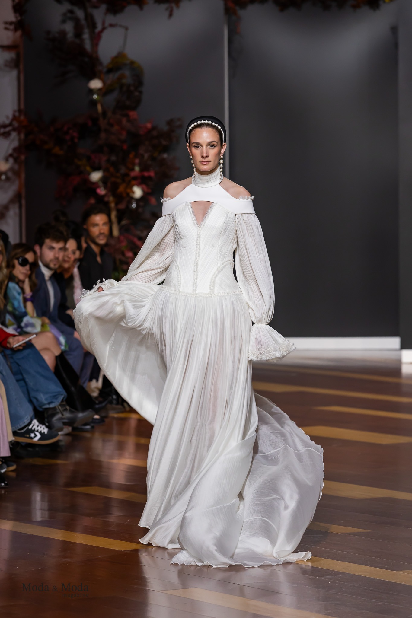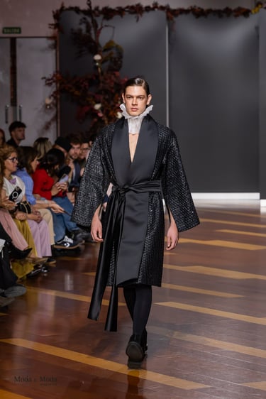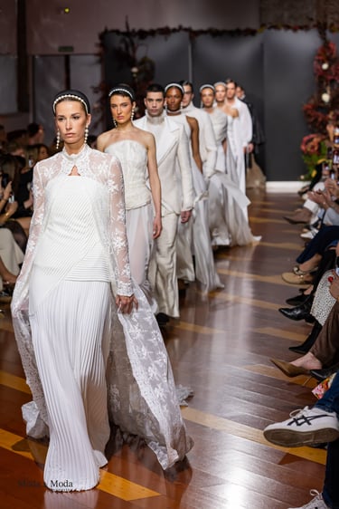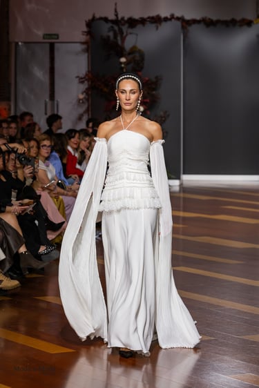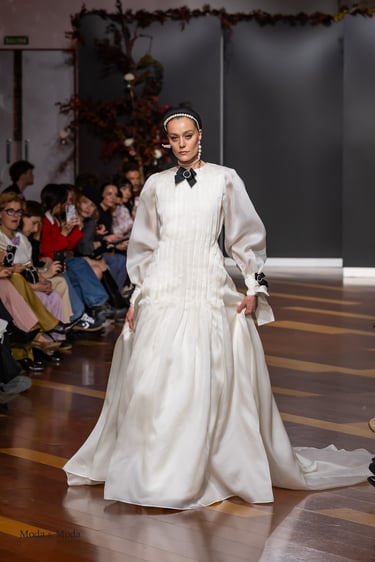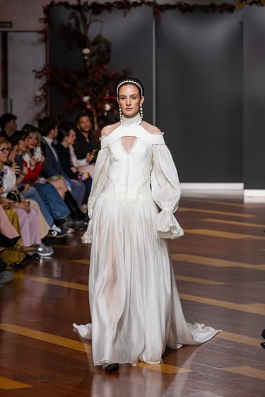 Los vestidos evocan la riqueza visual de los tapices antiguos, reinterpretados con una sensibilidad actual. Corsés de estructura arquitectónica esculpen el cuerpo con precisión, mientras que las faldas fluyen con ligereza, como si recorrieran los largos pasillos de un palacio florentino al amanecer. Las proporciones, los volúmenes y los cortes dialogan entre la tradición y la modernidad, creando una estética atemporal que reivindica la individualidad de cada mujer.