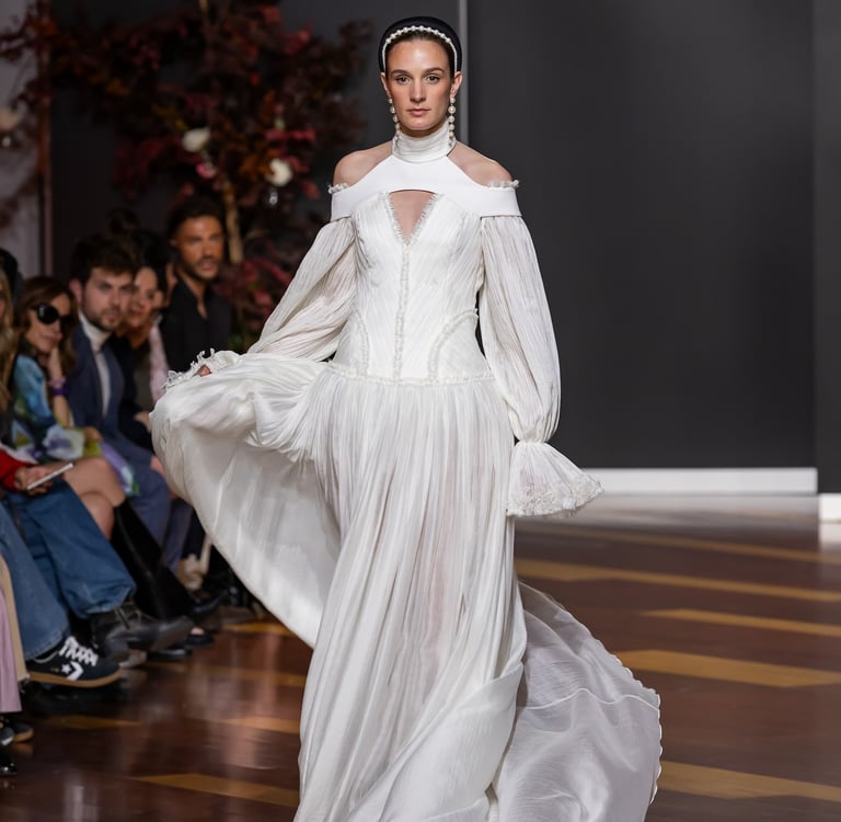 Bajo esta poderosa inspiración, BREA construye una colección que trasciende lo nupcial para adentrarse en el territorio de la narrativa. Cada diseño es un capítulo, cada silueta una declaración. La colección nace como un viaje sensorial a los salones dorados de los Medici, donde el mármol se suavizaba con seda, la luz se filtraba entre frescos y tapices, y los juramentos se sellaban entre encajes, perlas y miradas eternas.