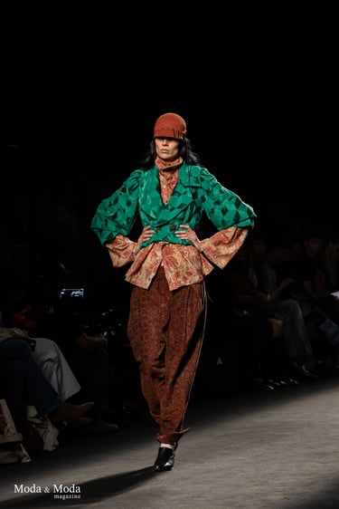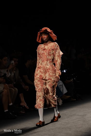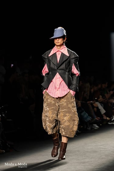 En la pasarela, la colección se articula a partir de una fusión contrastante: opulencia barroca (tejidos como los de tapicería, siluetas voluminosas, detalles exagerados) frente a la contención contemporánea (paleta más sobria hacia el final, formas más depuradas). Las mangas abullonadas, los pantalones bombacho y los trabajos de patrón experimental se combinan con una sastrería cuidada. La dualidad entre lo decorativo y lo funcional, entre lo histórico y lo moderno, marca cada pieza.