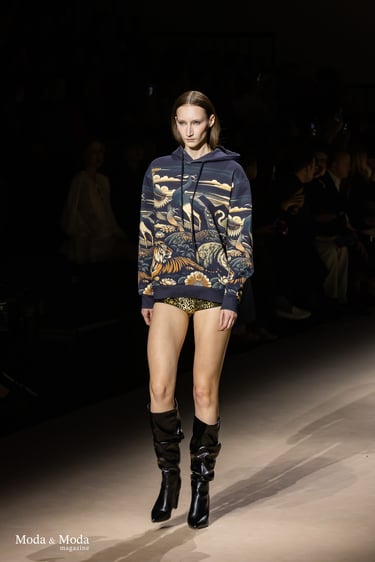 La colección presentada, titulada “The Hotel”, responde a la visión transversal de la firma: prendas atemporales, versátiles y sin límite de género o temporada, concebidas para acompañar el estilo de vida contemporáneo. Detalles como siluetas fluidas, tejidos de alta calidad —desde sedas y lanas hasta algodones e ikats artesanales— y una paleta de colores inspirada en la naturaleza (negros, arenas, marrones y vibrantes verdes) definieron la propuesta.