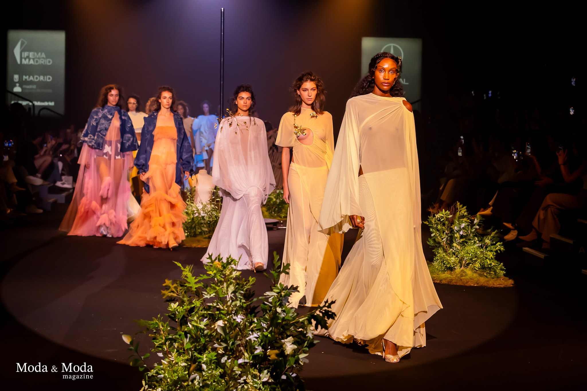La escenografía del desfile fue diseñada para sumergir al público en el universo creativo de María Lafuente. La iluminación dinámica simuló cambios naturales de luz, desde amaneceres hasta crepúsculos, mientras que la música original, creada especialmente para la ocasión, combinó sonidos naturales con elementos electrónicos, reforzando la temática de la colección.