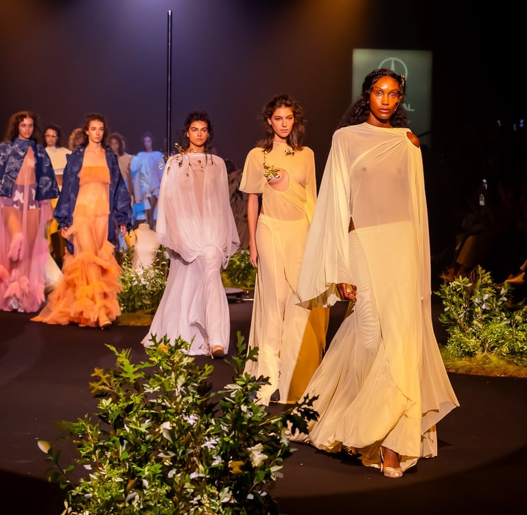 Los movimientos de los modelos fueron coreografiados para enfatizar la fluidez y la interacción entre las prendas y el espacio, creando una experiencia inmersiva que trascendió la tradicional presentación de moda y se acercó a una performance artística.