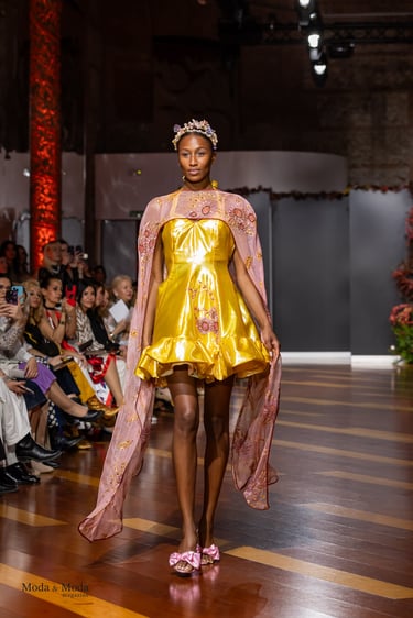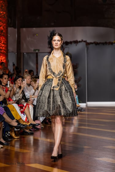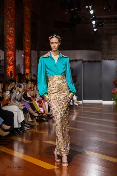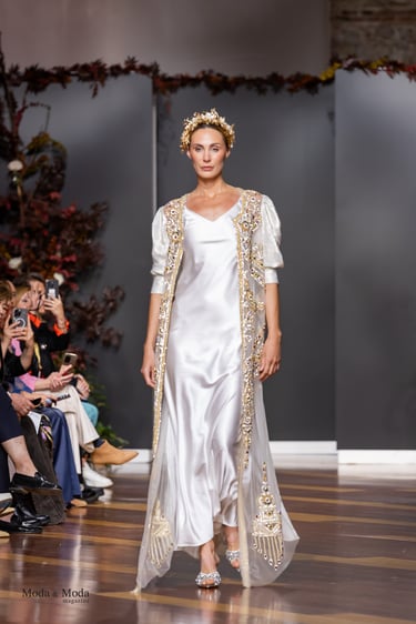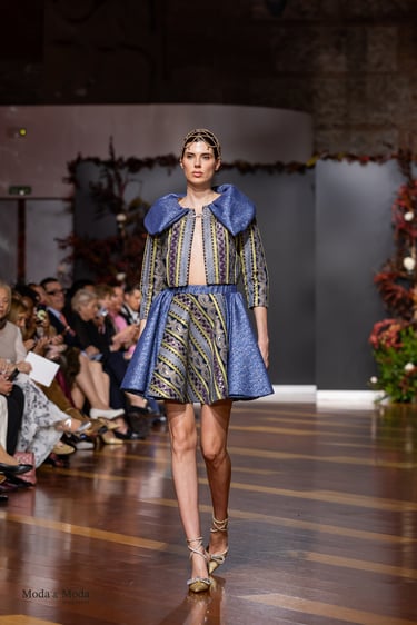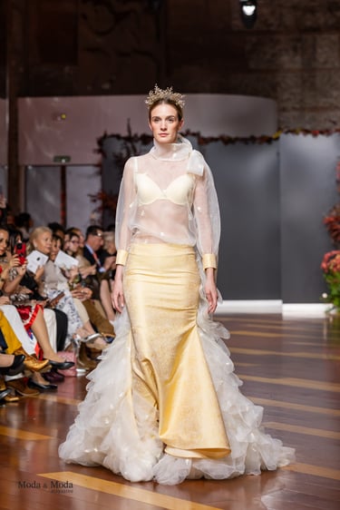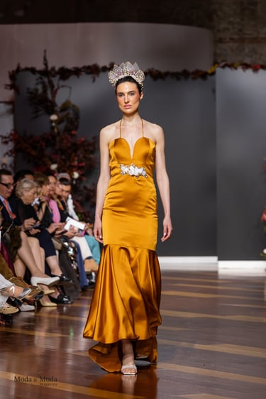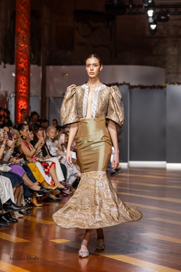 La colección se inspira en el legado textil y artístico, estableciendo un puente entre épocas. Una propuesta que evoca el mundo Neoclásico y Barroco, con líneas muy femeninas que hacen brillar a la mujer, reinterpretando la opulencia histórica desde una mirada contemporánea.