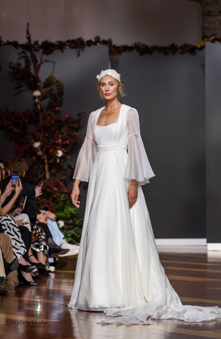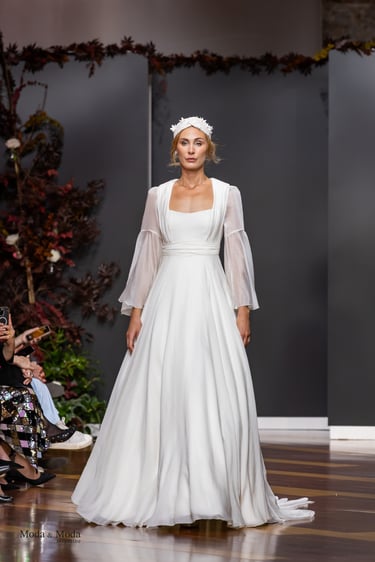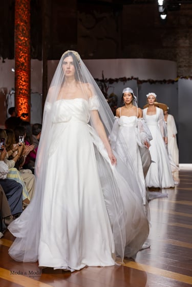La novia de Inmaculada Rodrigues se define como romántica y fresca, pero también consciente y segura de sí misma. Sus diseños abrazan el cuerpo con sutileza, sugiriendo sin artificios. Es una mujer que entiende la tradición como raíz y la tendencia como evolución, caminando con identidad propia.
