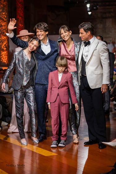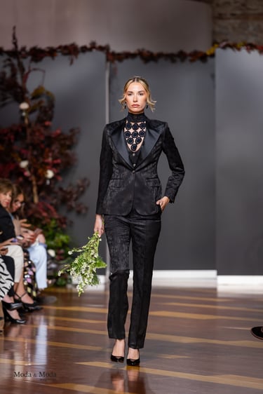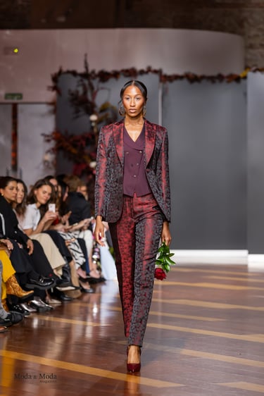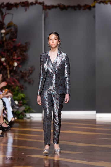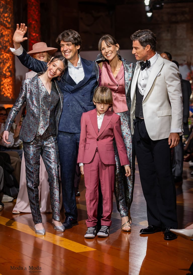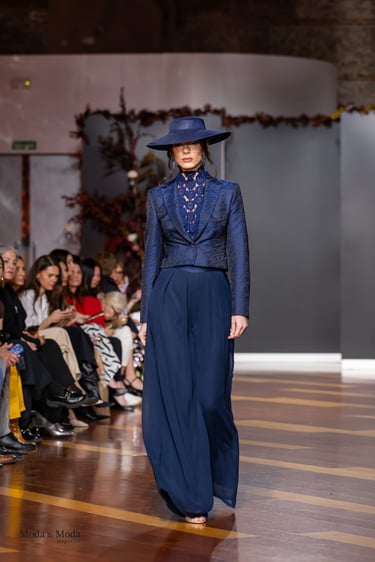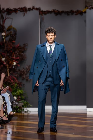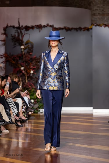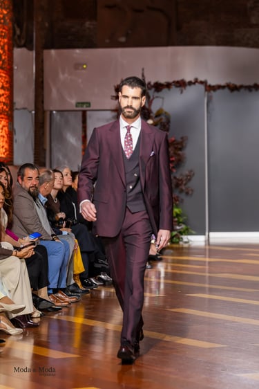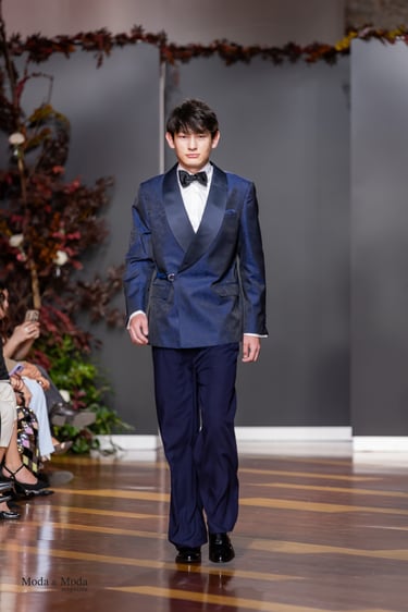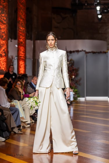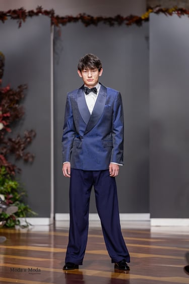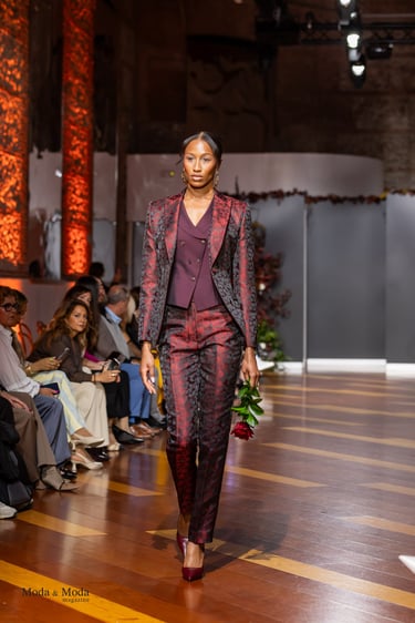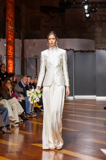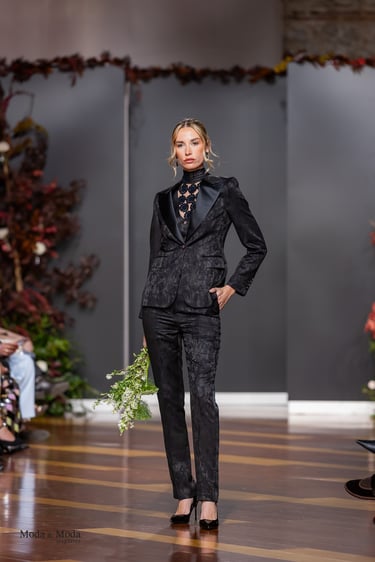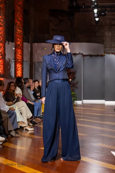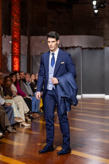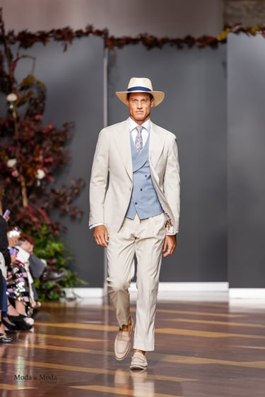 El Atlántico, la lava volcánica y los paisajes del archipiélago se reflejan en una paleta cromática profunda yelegante que incluye azul navy, verde atlántico, burdeos volcánico, crema arena y negro absoluto. Entre las propuestas más destacadas se encuentra la reinterpretación del smoking contemporáneo, conversiones en negro profundo con texturas sutiles y combinaciones de chaqueta blanca con pantalónnegro, una apuesta sofisticada que redefine la estética de ceremonia actual.Los chalecos adquieren también un papel protagonista dentro de los looks, aportando contraste cromáticoy estructura a las composiciones de sastrería, mientras que accesorios como sombreros, pañuelos ycalzado elegante completan la imagen de un viajero contemporáneo.
