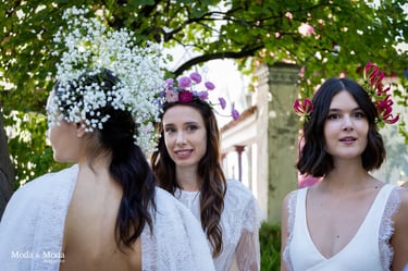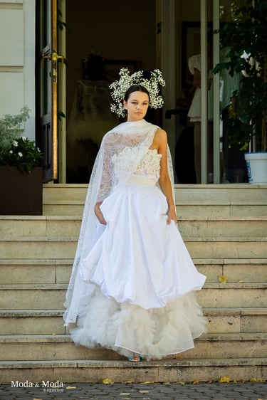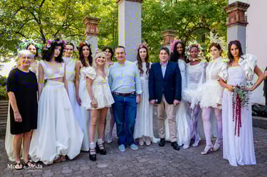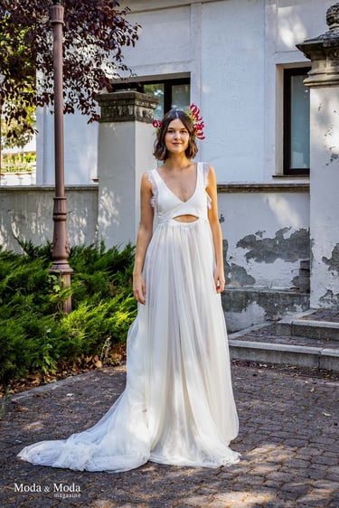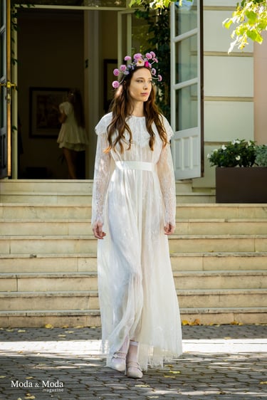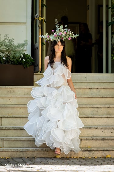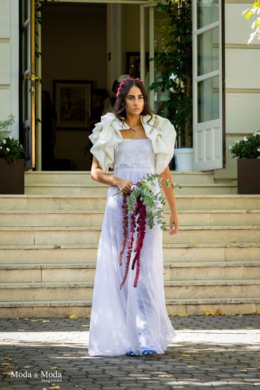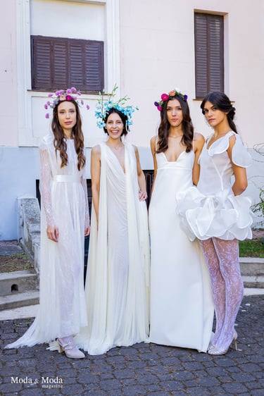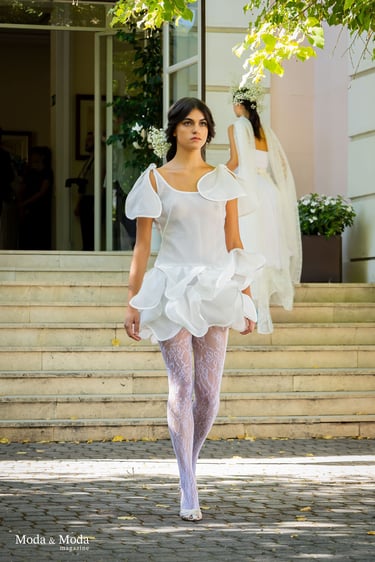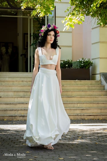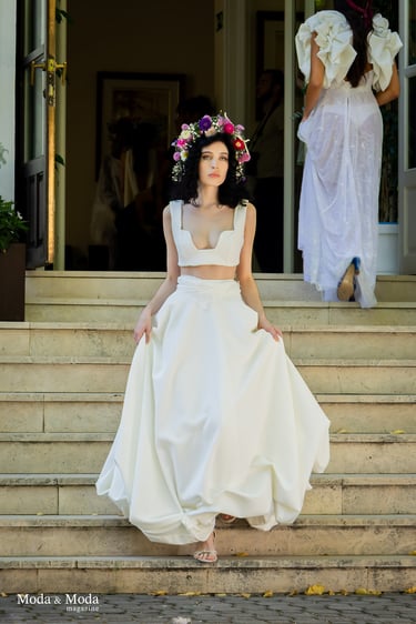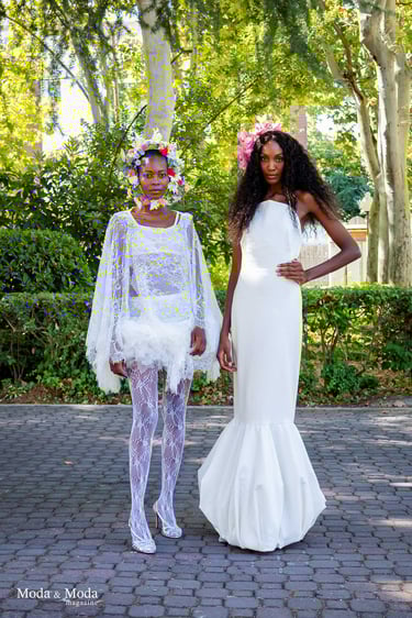 La paleta de Colores y la combinación de siluetas presenta la colección que se caracteriza por siluetas orgánicas y fluidas que reflejan movimiento y libertad, simbolizando la conexión íntima entre la mujer y su entorno. La paleta cromática es suave y armoniosa, transitando por tonos que evocan pureza y calidez: Con el blanco la pureza, inocencia y la luz. Marfil elegancia atemporal y sofisticación. Melocotón Dulzura y feminidad delicada. Rosa amor ternura y energía femenina. Nácar (destellos)brillo sutil que aporta profundidad y luminosidad.