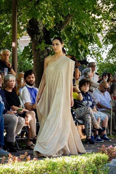 El desfile, abierto al público, se convierte así en una experiencia sensorial y emocional, donde la moda se convierte en un vehículo para celebrar la singularidad y la energía femenina a través de la sostenibilidad y la artesanía.