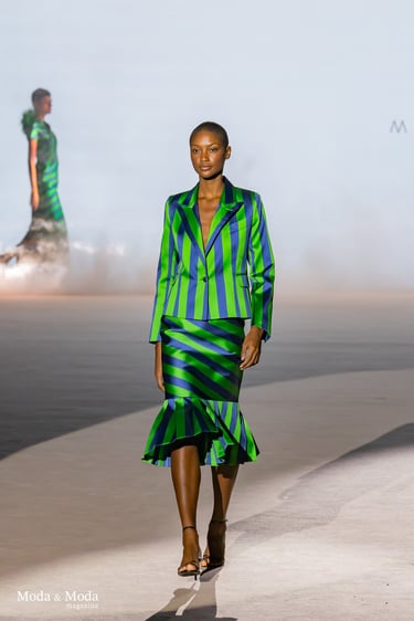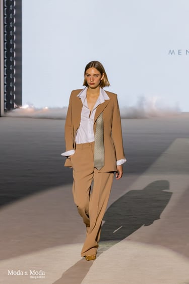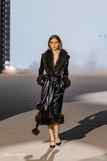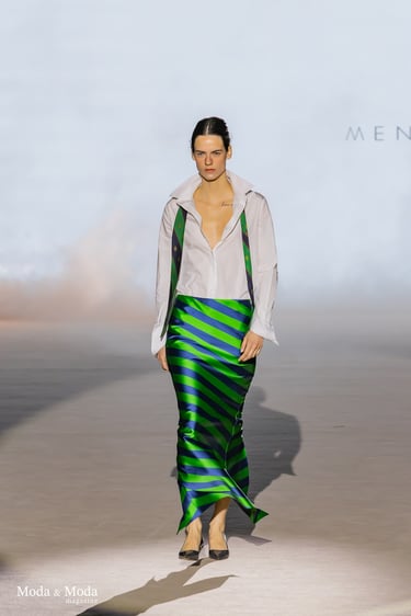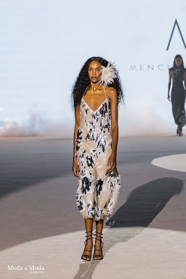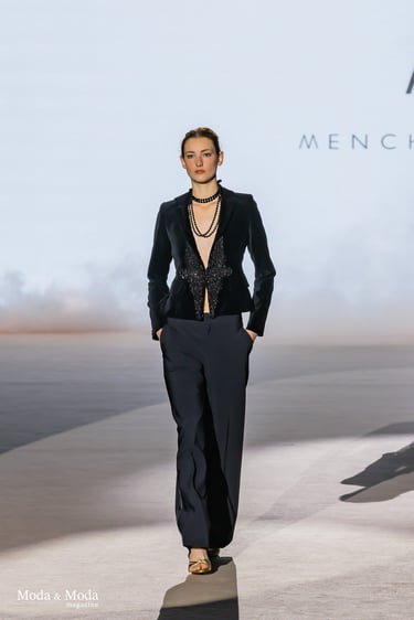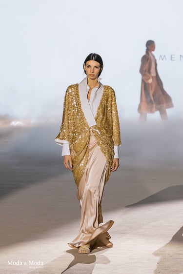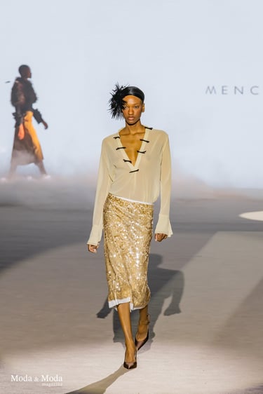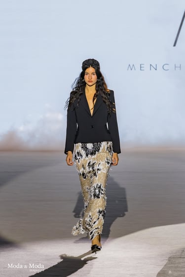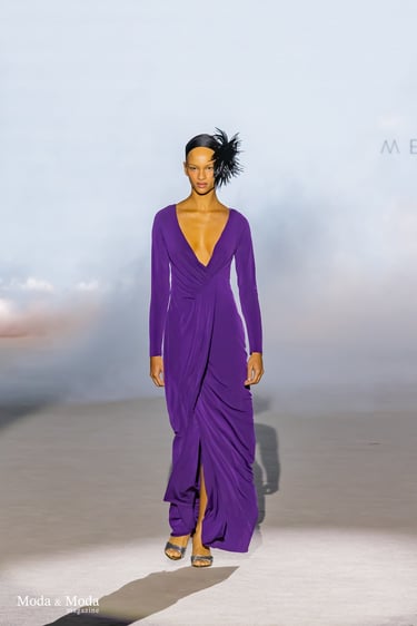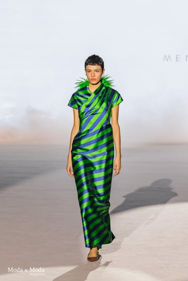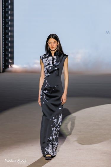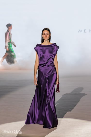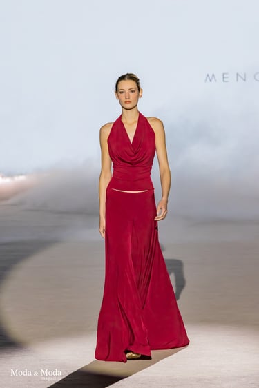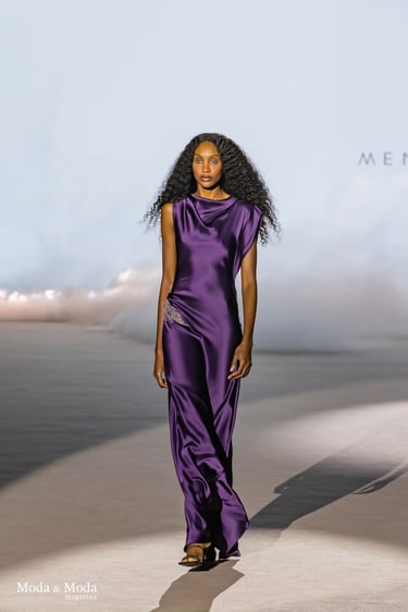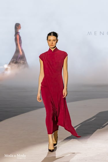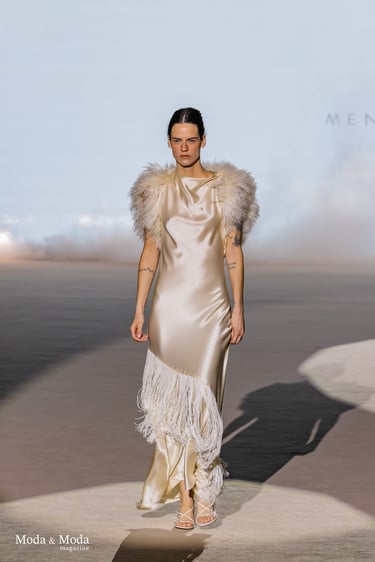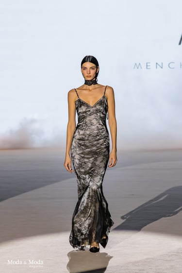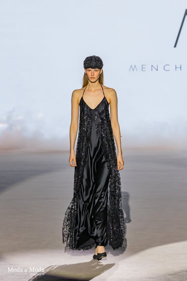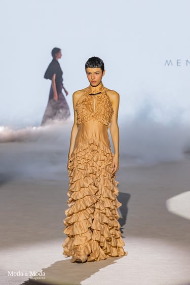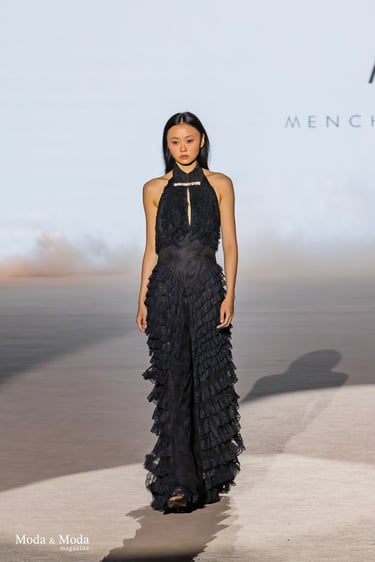 Las siluetas se caracterizan por vestidos fluidos, volúmenes estratégicos y transparencias sutiles, creando piezas dinámicas que evolucionan con el movimiento. En conjunto, “Ethereal Bloom” transmite un mensaje de resiliencia, evolución y elegancia atemporal, consolidando la identidad estética de Menchen Thomas dentro de la moda contemporánea.