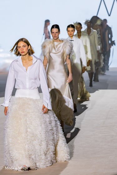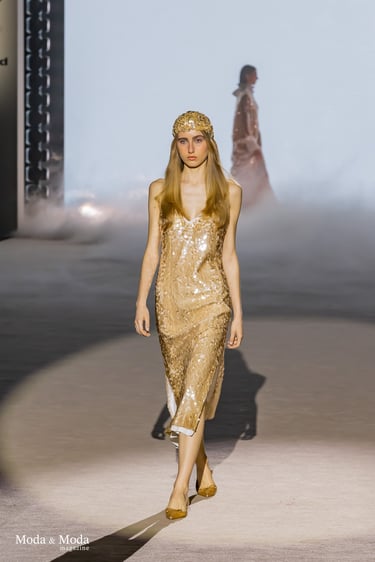 En cuanto a los materiales, destacan tejidos ligeros como gasas de seda, tules y organzas, que aportan movimiento y ligereza, junto con bordados artesanales, aplicaciones florales en relieve y detalles metálicos que enriquecen las prendas. Además, la firma incorpora tejidos con un enfoque más sostenible, reforzando su compromiso con una moda consciente.