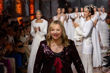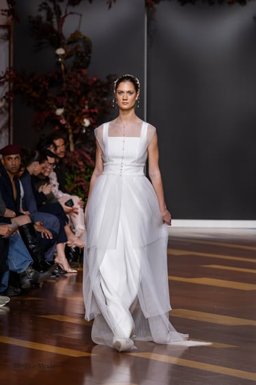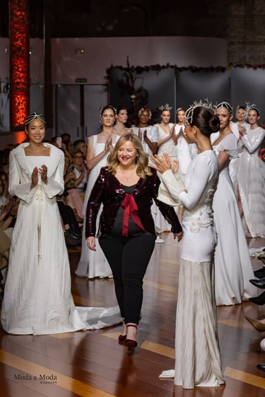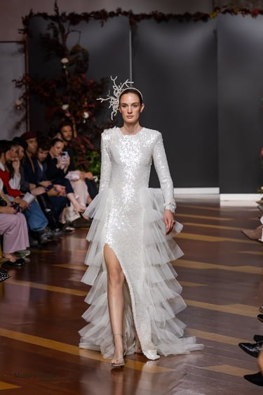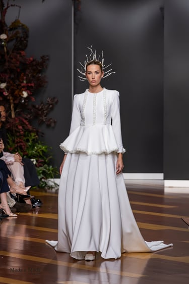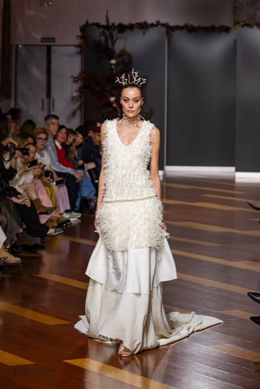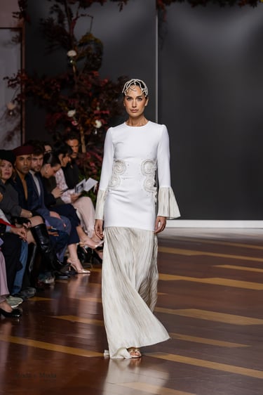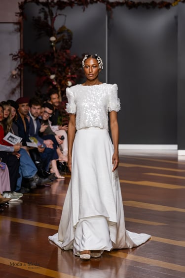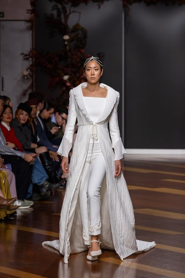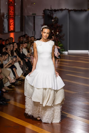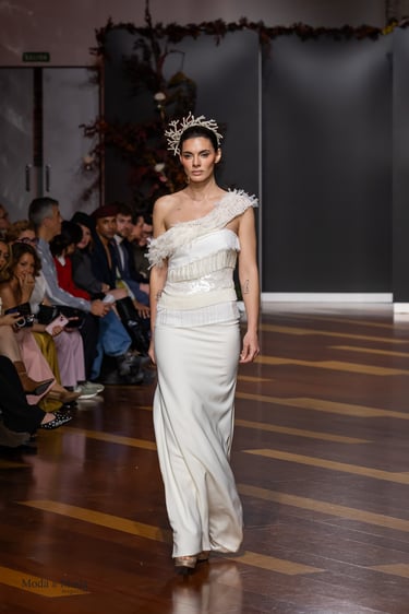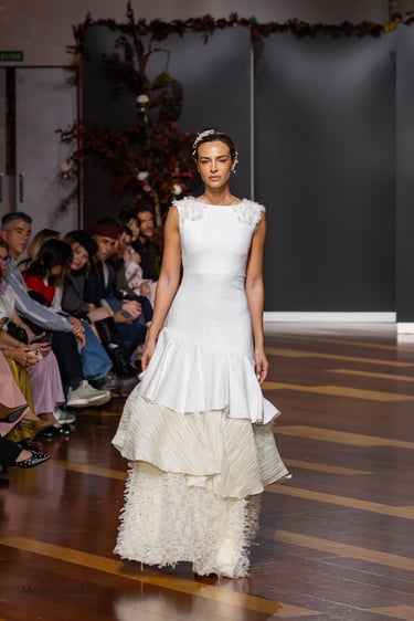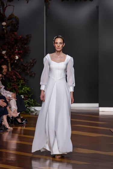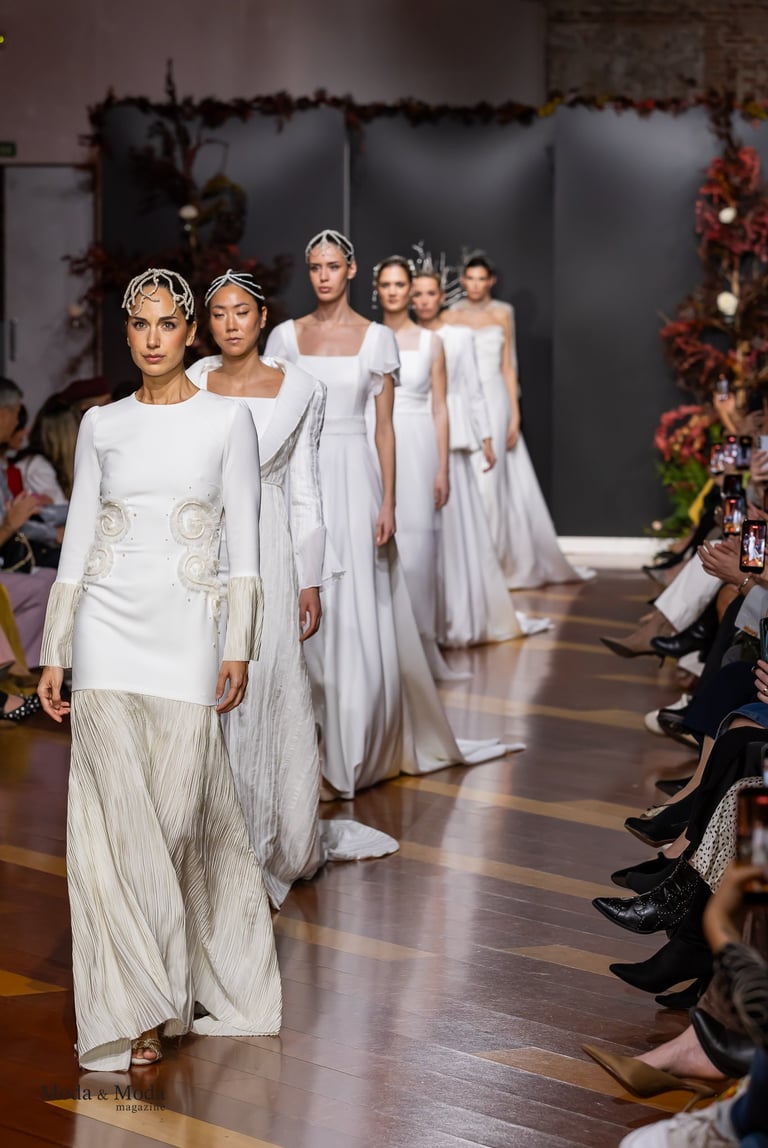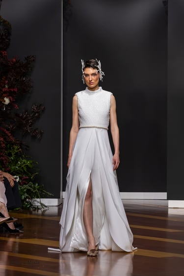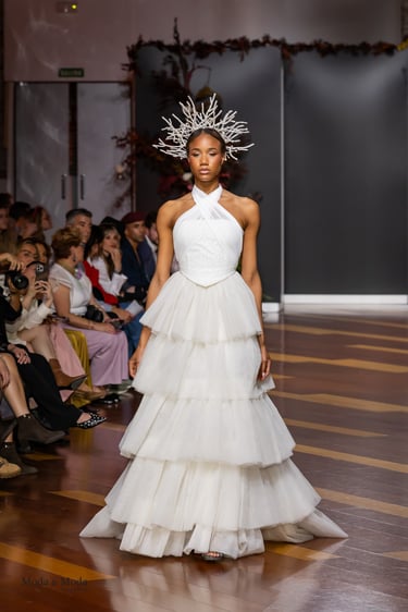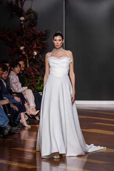 Las siluetas, variadas y equilibradas, están concebidas para realzar la figura femenina combinando estructura y fluidez. Cada diseño pone en valor los acabados realizados a mano y el trabajo artesanal como esencia fundamental de My Schneider Madrid, reafirmando su apuesta por la confección a medida y por un lujo basado en el tiempo, el oficio y la verdad.