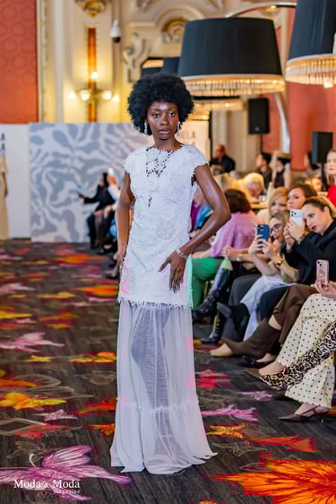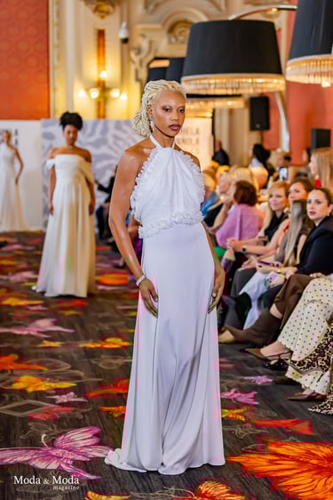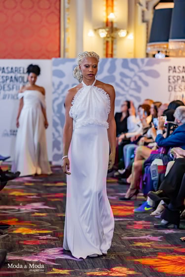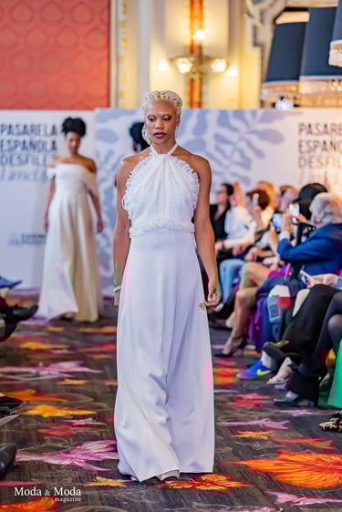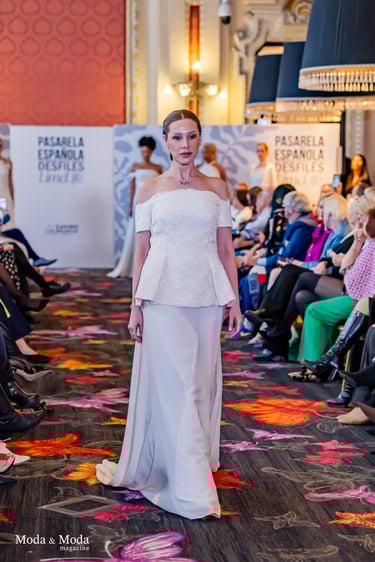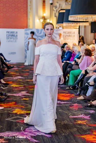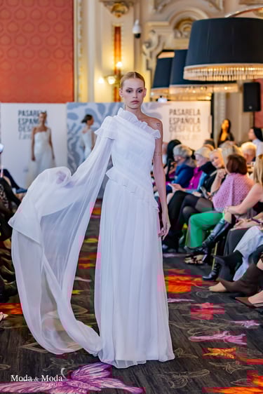 Su lenguaje creativo se define por una estética pura y marcadamente femenina, donde la suavidad de las formas convive con un romanticismo actual. Sobre la pasarela, Alexandra Ferrer presentó siluetas que transmitían ligereza y delicadeza, con flores aplicadas a mano que se convertían en elementos centrales, aportando un toque poético a cada prenda.